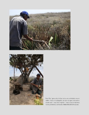 "Don Flor" aprovecha la flora nativa en actividades susten- tables. Utiliza la lechuguilla, un tipo de agave del cual se extrae ixtle —una fibra vegetal—, con la cual se elaboran varios productos y artesanías. Fotos: Elizabeth Ruiz/AMC.